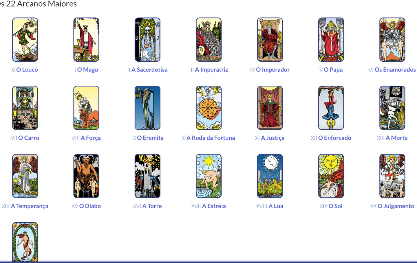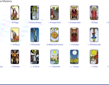A base do Tarot é formada pelos Arcanos Maiores. São ao todo 22 cartas, sendo 21 numeradas e uma sem numeração, que é a carta O Louco. Representam as diretrizes divinas e o caminho para a consciência, descrevendo os vários estágios que encontramos em nossa busca por significado e compreensão das coisas.